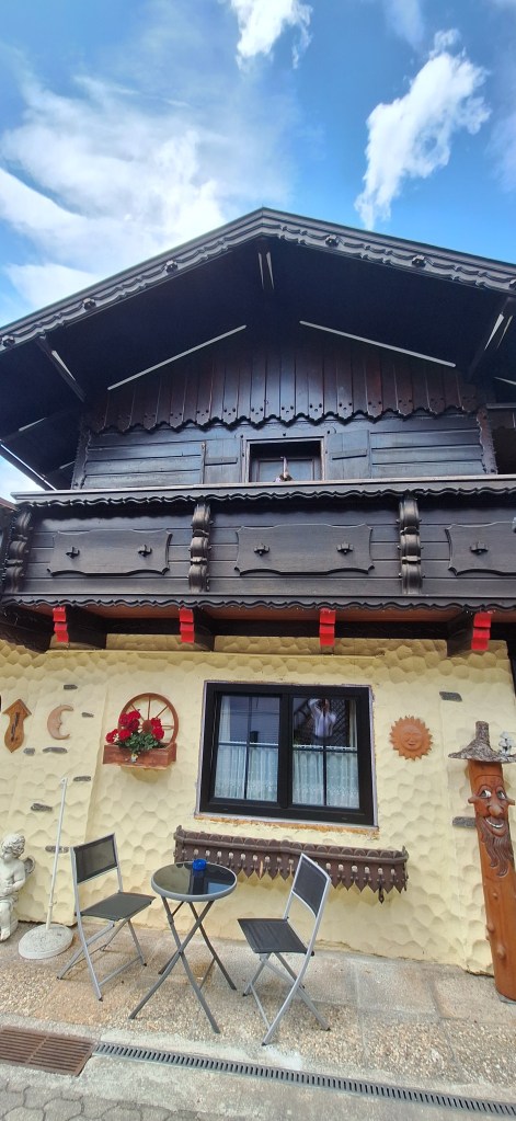 Încet, valea se deschide, traficul se întețește, șoseaua revine la 2 benzi bine demarcate, camion… șantier… pauză… e cald iar. Sus era mult mai bine. „Bă, filmezi?” aud în cască. „Da, nu vezi ce țanțoș stau pe motor cu capul ridicat să prind tot?” Drumul drept se îndreaptă către un masiv impunător. Masivul Grimming, cu o altitudine de 2351 metri și o proeminență de 1518 metri, se ridica înspăimântător direct în față. Virăm la dreapta pe Ennstalstraße pentru câțiva kilometri. „Asta e benzinăria unde ne-am oprit anul trecut” rostim simultan în microfon, râzând. „Da, dar anul trecut eram 3” îmi spun în gând. Cotim stânga prin sensul giratoriu – a se înțelege că am părăsit sensul la ieșirea aferentă virajului către stânga – masivul trona tot în stânga noastră și, după vreo 10 kilometri, ajungem la cazare. O curticică, parcă desprinsă din povești, cu multă verdeață, animale de ceramică, cele două case scunde, împodobite cu lemn, tipic zonei, cu var galben și sculptat, parcă era înghețată. Primul feeling dat era „Hansel și Gretel”; să sperăm că povestea nu e inspirată din fapte reale. Curtea e lungă și îngustă, pe stânga cele două case, separate de un garaj în care se află o motocicletă, iar pe dreapta, bănuiesc că era un atelier. Streașinile jos, doar o idee mai înalte decât mine, cu lemn sculptat, ghivece pline cu mușcate colorate la fiecare geam. Gazda primitoare spune că am ajuns mai devreme decât am anunțat, dar nu e problemă, că apartamentul e pregătit. În căsuța din capătul curții… cu tot ce îți trebuie… Bianca’s Ferienwohnung (sper că nu se consideră reclamă). Doamna ne spune că nici nu trebuie să ocolim până la Spar, deoarece ea a făcut portiță în gardul mic din lemn ce separă magazinul de casa ei. Mișto idee.