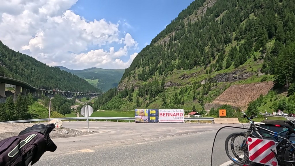 După trecerea în Austria, drumul cotește brusc la dreapta într-o coborâre care – noroc că era un semafor de lucrări și am putut sta vreo 5 minute – ne-a dat ocazia să vedem cât de impresionant era cocoțată autostrada pe versantul abrupt al dealului, să studiem lucrările de întărire ale versantului, cum imensele coloane susțin plăcile masive. A fost prima oară de când plecasem de acasă când am savurat ambuteiajul. După virajul la dreapta, șoseaua cotea larg la stânga – se și vedea din poziția noastră –, apoi iar la dreapta, după coama unui deal. După acea coborâre, drumul șerpuiește de-a lungul văii care încet-încet se deschide și abia atunci îți dai seama că gradul cu care șoseaua a coborât nu a fost unul foarte mare. Satele trec unele după altele, cu arhitectura specifică Tirolului – am întâlnit-o și pe „Maitrei” – satului îi spune Matrei am Brenner, dar mie-mi plăcea mai mult „Maitrei”.