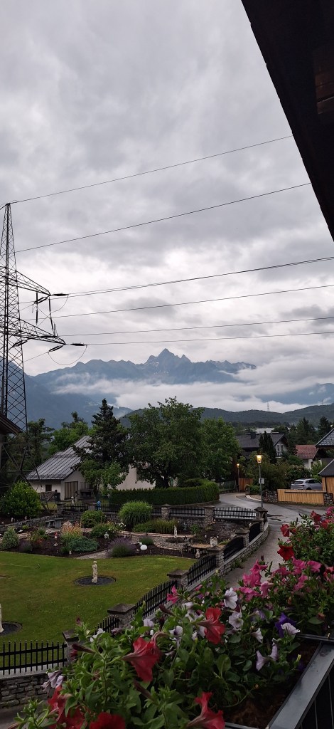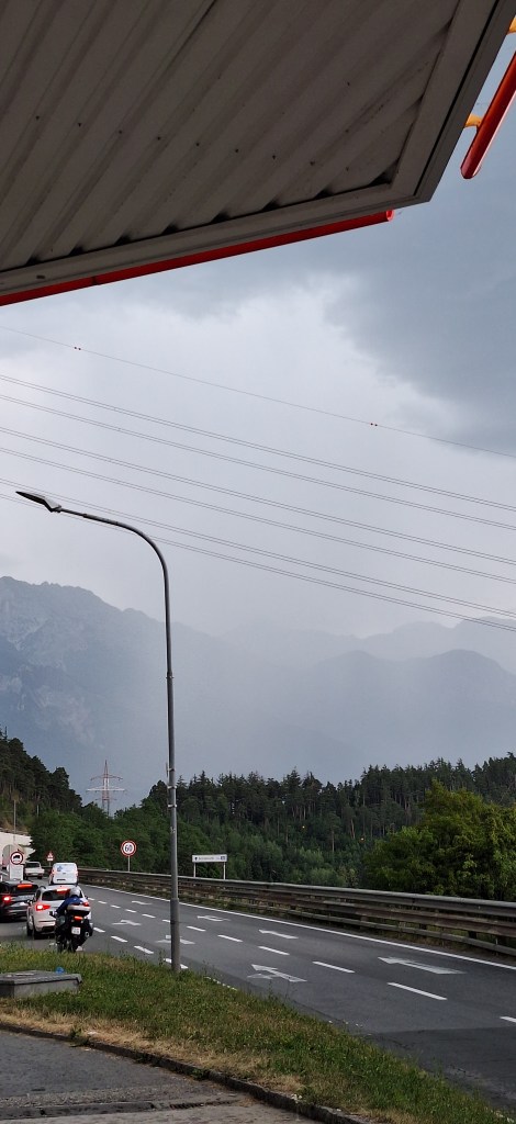 Nervi, draci, chemăm toți sfinții iar… contact… liniște. Ne scărpinăm, ne învârtim, umblă la tabloul de siguranțe… toate întregi. Se uită pe bord… are curent. Cum pana mea? Cheie. Pornește. Ne uităm unul la altul în gol… „Mai încearcă o dată” zic. Oprește. Contact. Cheie… pornește. „Aplicația meteo ce zice?” mă-ntreabă. „Mă, nu arată bine, uite, ploaie tare, grindină și fulgere, frontul trece pe aici cam în 15 minute și o să țină cam o oră.” Îi arăt telefonul. „Nu ajungem până la cazare plus că noi am merge exact în direcția lui.” Decidem să așteptăm. Eu, obișnuit fiind ca la pustă să văd norul de ploaie cu o zi înainte, aici exact din direcția din care venea era ditamai dealul. Priveam direct în sus. Într-adevăr norii deveneau mai gri, mai gri închis, mai denși. Mă-ntorc cu privirea spre Innsbruck: rupere. Ploua de mama focului. Hai să așteptăm. Facem vânzare magazinului, cumpărăm ceva patiserie, un cârnaț sticks, o apă cu gust, ne așezăm alene pe băncuța de la locul de fumat… vântul se întețește și apar și primii stropi, mai timizi așa. Nu ne dăm speriați.