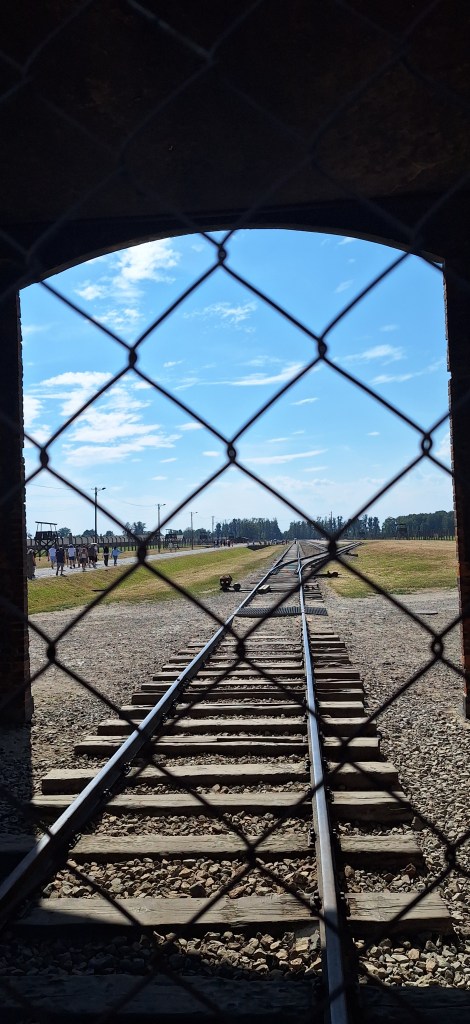 Probabil că cei ce au fost vor spune că ce scriu este subapreciativ, dar nu se prea poate descrie în cuvinte, deoarece fiecare are altă stare de spirit. Nu îți poți da seama de dimensiunile lagărului nici dacă ești acolo, dincolo de gard. Șoseaua către parcare ne duce pentru puțin timp pe lângă gardul de sârmă al lagărului. Arunc scurte priviri și nu am nicio reacție. Acum îmi dau seama de ce. Imaginea am mai văzut-o în filme, documentare, cărți, dar când ești acolo e diferit. Evident, parcăm motoarele în parcarea amenajată și pornim la pas către intrare. Înaintăm încet, pe trotuarul arzând, privind la clădirea din cărămidă, la arcada din centru cu poarta de plasă de sârmă, în dreapta la calea ferată, care pentru mulți fusese ultima stație. În dreapta porții, o gheretă a paznicului de la intrare, oameni îmbrăcați viu colorat – singurele conexiuni cu prezentul și realitatea confortabilă – de-o parte și de alta garduri înalte cu culmi de sârmă ghimpată, lângă care se înalță un foișor, iar după, barăcile din lemn. Soarele arde, iar liniștea e apăsătoare. Cu fiecare pas, cizmele parcă devin mai grele, pașii mai rari, respirația mai înfundată. Clădirea de cărămidă roșie umple câmpul vizual, ascunzând simbolurile mortuare, ușurând parcă starea. În stânga porții, panourile informative aduc un iz de confort, confirmând preteritul masacrului, dar nu și recurența acestuia. Nu intrăm, lui Norbert nu îi pică bine și, dat fiind faptul că a fost de acord să vină măcar până aici, nu forțez nota. În plus, aveam tot calabalâcul după noi și era foarte cald. Când stai în fața porții și privești prin plasa de sârmă, linia de cale ferată, platforma pe care au pășit îngroziți pentru ultima oară mii de oameni, inevitabil – pentru mine cel puțin – îți rulează în minte imaginile văzute în filme. Altă referință nu ai – Doamne-ajută și sper să nici nu avem parte de altele – și rămâi tăcut și privești în gol. În clipa aia mintea mi se golise, amorțise, picioarele parcă se cimentaseră, nici geaca sau casca moto nu le mai simțeam în mâini, nici căldura. Stăteam și priveam în gol, iar în minte îmi rulau fără ordine toate imaginile văzute, toate textele citite. Ochii îmi căutau fără logică puncte de reper, dar nu fixau niciunul. De cele mai multe ori, când privesc o construcție, încerc să îi văd utilitatea în istorie: cum arăta acum 100 de ani, cum era folosită. Acum, aici, nu. Nici nu era nevoie. Știam foarte bine și nu doream să știu. De data asta nu încercam, de data asta acele informații parcă îmi intrau forțat în minte. Sunetul metalic al frânei vagonetului, clancul metalic al clampei, zăngănitul armării mitralierei, zăngănitul plasei de sârmă la închiderea porții, sunetele pașilor împleticiți haotic pe rampele de lemn, țipetele de disperare sau teamă, răcnetele autoritare, trasul adânc dintr-o țigară al unui ofițer în ușa biroului privind flegmatic sau rece, râsetele altor ofițeri. Toate sunt departe. În locul lor a rămas liniștea apăsătoare. Singurele distracții sonore care mă mai făceau să revin la realitate erau dialogurile în diferitele limbi, care păreau ignorante – unele dintre ele – față de locul unde se aflau. O conversație în rusă sau ucraineană mă face să revin în prezent. Nu îi înțeleg. Pășesc încet către dreapta, de-a lungul gardului înalt cu sârmă ghimpată. Încerc să cuprind cu privirea orizontul cu barăcile din lemn rămase în picioare. Sunt prea multe. Tot nu am ce să zic… cuvintele ies câte două-trei, parcă forțate să spargă liniștea care mi se părea stânjenitoare. Norbert răspunde la fel. Dar nu era stânjenitoare, era grea, ca un sac de bolovani; ne deranja greutatea și mințile noastre căutau fără șansă o scăpare. 1,1 milioane de oameni nu au mai plecat de aici. Pentru că pur și simplu au existat. Pentru că, pur și simplu, suntem atât de înapoiați și reduși mintal încât credem orice place urechii și un individ poate băga frica în milioane de oameni. Gardul înalt cu sârmă ghimpată, în alte locuri, e doar un gard, doar fier și ciment. Aici e altceva. Aici e o graniță, o limită clară între umanitate și monstruozitate, între viață și moarte. Singurul lucru care transmite viață prin gardul de sârmă e iarba. Restul e mort, rece și tăcut. Pereții de scândură ai barăcilor încă păstrează în secret miile de lacrimi, miile de rugăciuni, miile de declarații de dragoste făcute în neant, miile de blesteme.