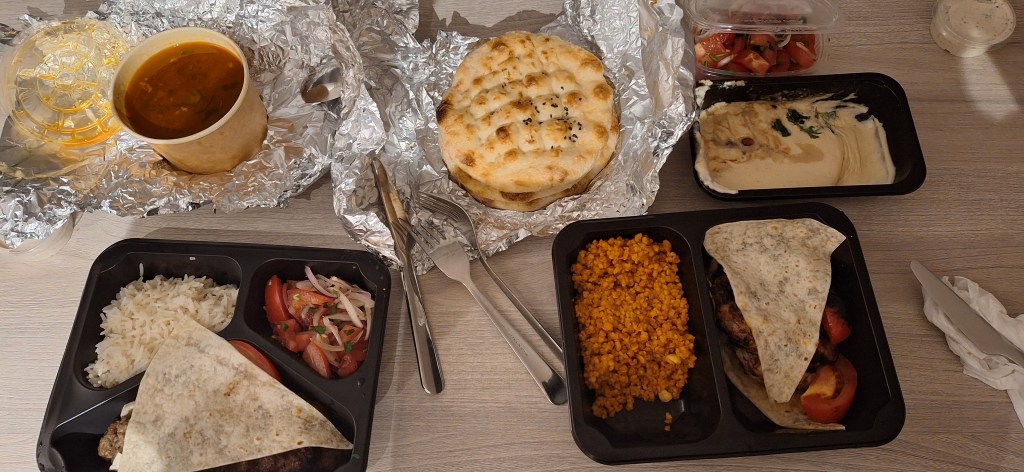 Comandăm mâncare arabă. Ca să creez un background: nu mă dau în vânt după sarmale, după mici, după „porcării” – caltaboș, slănină etc. – după multe rețete tradiționale și de multe ori mă întreb dacă nu mi-s înfiat. Eu prefer paste, pizza, șnițel și multe alte chestii non-locale. Ei bine, am înfulecat mâncarea aia – nu cred că era doar foame acolo – cu ochii mari, pe care îi închideam când înghițeam. Nu îmi amintesc exact ce am luat, dar rețin că aveam humus, NU aveam cartofi prăjiți, legume, el luase și o zeamă delicioasă, carne de pui și oaie, toată amestecătura aia a fost divină, nici nu am putut mânca tot.